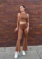 Brown high-waisted flared leggings offering both comfort and style, ideal for workouts or casual wear.